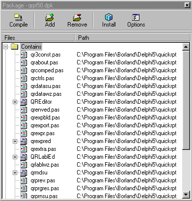 Note for C++Builder users at the bottom of the page. There are two libraries - design-time Dclqrt50.bpl and run-time Qrpt50.bpl ( in Delphi 6 read 60 for 50). What follows also applies to the QRExports package. The 'project' files for libraries are of type .dpk ( package definition), and these may be opened in Delphi like .dpr's. To rebuild and re-install the libraries, follow this procedure -